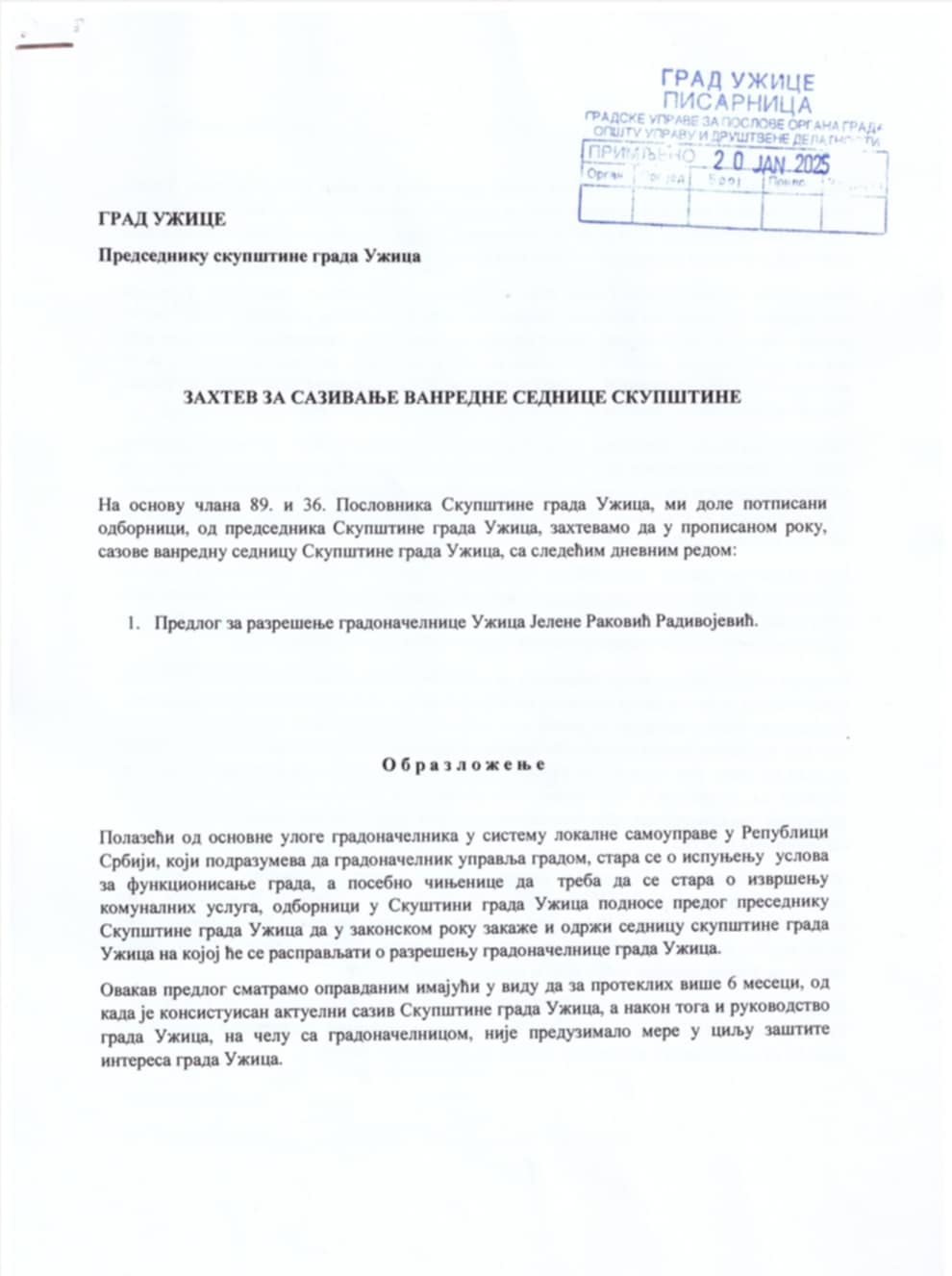 УЖИЧКЕ ВЕСТИ ФОТО РАЗГЛЕДНИЦА29 опозиционих одборника у Скупштини града Ужице предало захтев за ванредном скупштином јануар 20, 202503195 Komentari