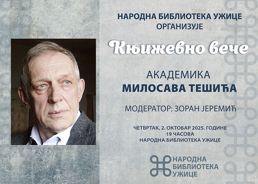У четвртак, 2. октобра 2025. године, у 19 часова, у Народној библиотеци Ужице биће одржано књижевно вече академика Милосава Тешића. Модератор је Зоран Јеремић, а програм се организује у оквиру прославе Дана града Ужица.