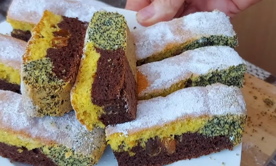 Плех обложити пек папиром или га премазати уљем. Дуж средине кашиком распоредити чоколадни део. Са обе стране око чоколадног дела распоредити мак, и сипати жути део.
