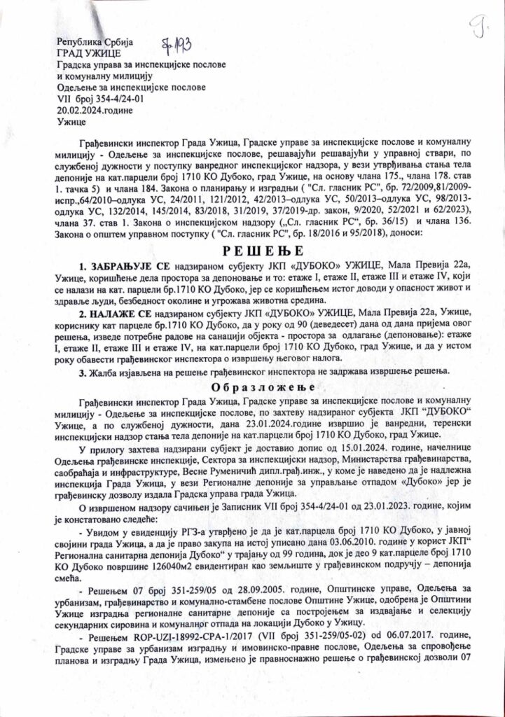 Градска упава за инспекцијске послове и комуналну полицију је доставила удружењу „ДА (НЕ) ДИШЕМО ДУБОКО!“ решење и записник грађевинског инспектора о ванредном инспекцијском надзору у вези утврђивања стања тела депоније на катастарсткој парцели број 1710 КО Дубоко, а који је спороведен 23. јануара 2024. године.