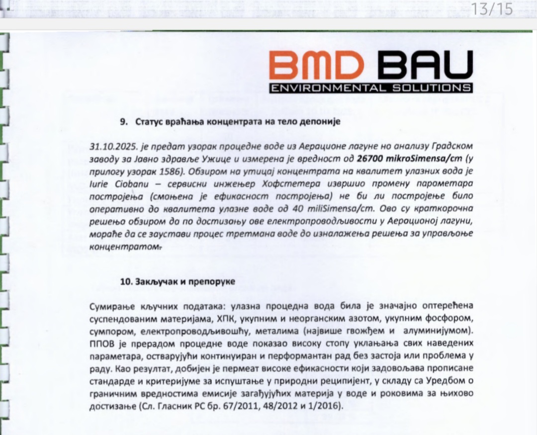 У извештају се упозорава да ће заустављање постројења ускоро бити неизбежно и да је неопходно што пре обезбедити услове да се концентрат не враћа у лагуну.
