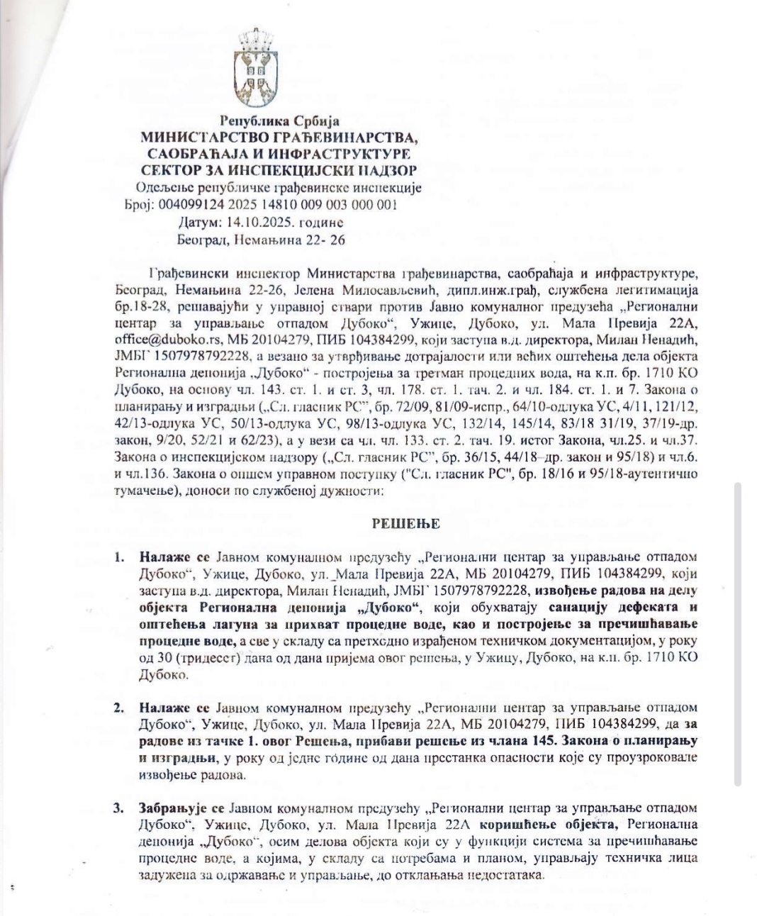 МГСИ је донео решење 14.10.2025. којим је наложило ЈКП РЦУО “Дубоко” извођење радова на санацији дефеката и оштећења лагуна, као и постројења за пречишћавање отпадне воде у року од 30 дана, као и да за ове радове прибави решење из члана 145. Закона о планирању и изградњи.