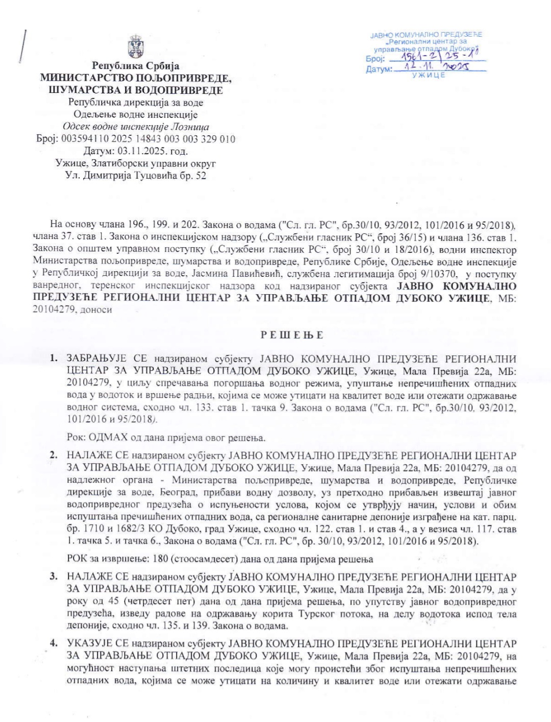 МПШВ је 3.11.2025. забранило ЈКП РЦУО “Дубоко” испуштање непречишћених вода у Турски поток, наложило да прибаве водну дозволу и да у року од 45 дана очисте корито.