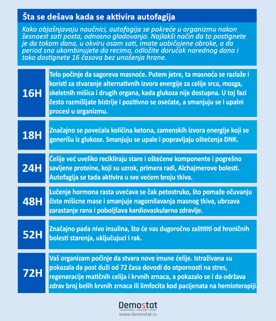 – Аутофагија је метаболички процес, који помаже да се ћелије ослободе отпада и токсина. У току аутофагије, у ћелији се уништавају непотребне и оштећене честице, као што су ћелијски отпадни материјал –најчешће оштећени протеини. Тај процес чисти ћелије од оштећених делова и замењује их новим деловима. На тај начин се, у току аутофагије, тело регенерише, спречава се убрзано старење и губи се вишак килограма. Поред тога, аутофагијом се значајно побољшава имунски одговор на вирусне, бактеријске и гљивичне инфекције, објашњава др Шкорић.