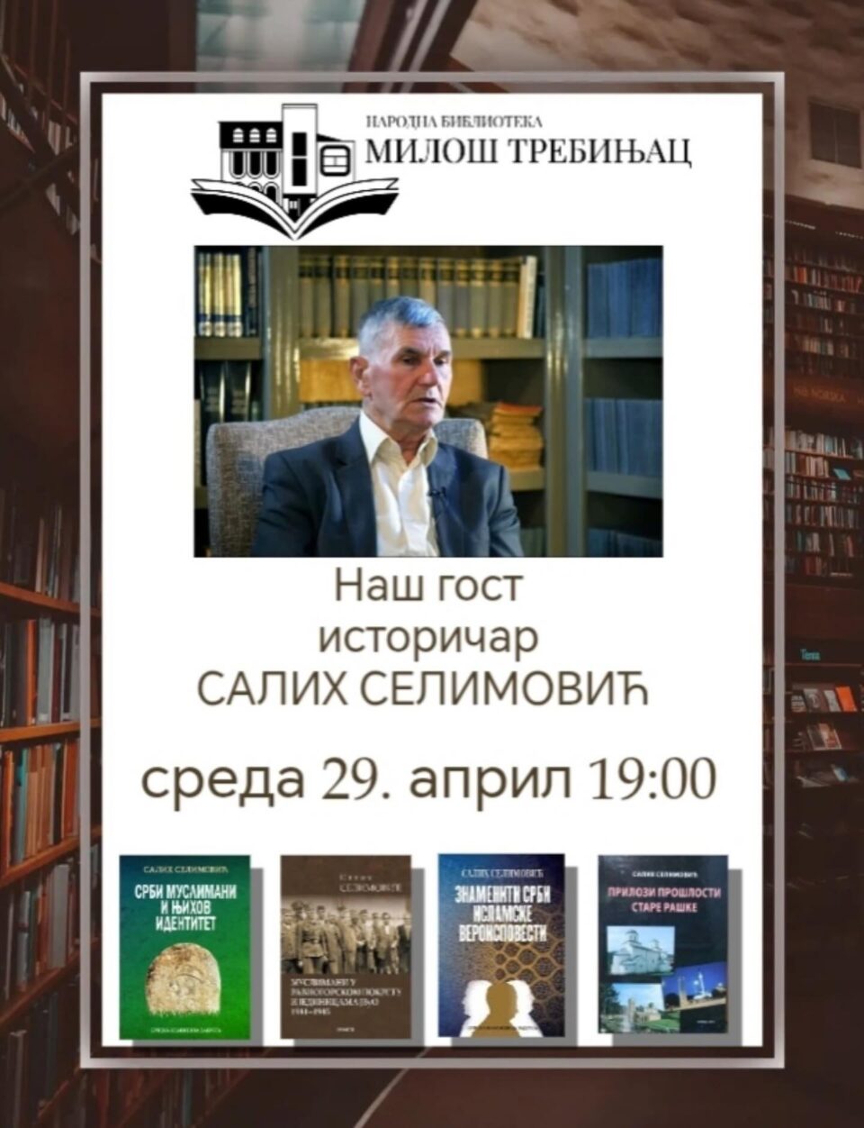 Народна библиотека „Милош Требињац“ угостиће вечерас , са почетком у 19 часова, историчара, професора и публицисту Салиха Селимовића.
