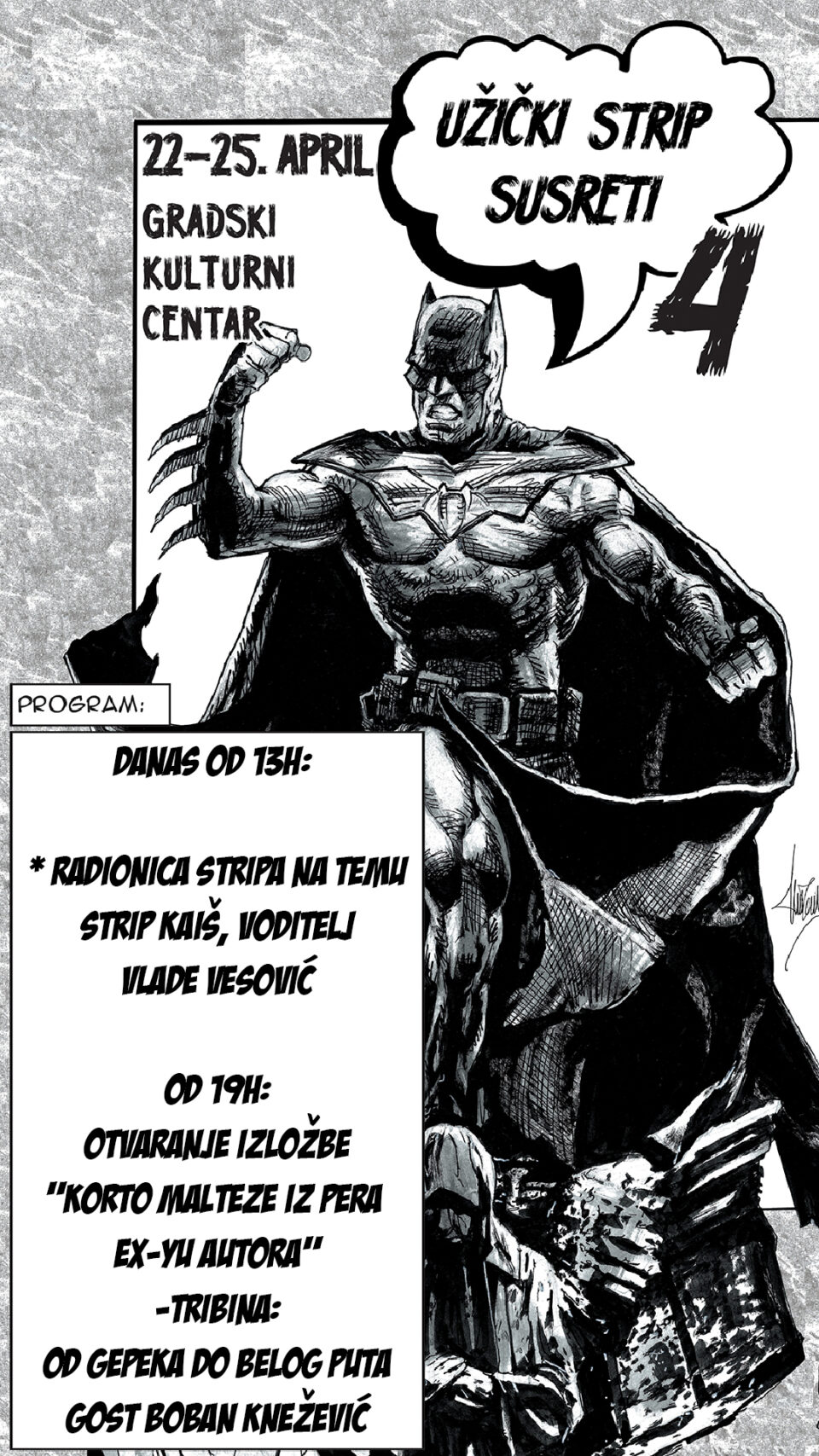 Од 19х у Великој сали биће отворена изложба “Корто Малтезе из пера ЕX-YУ аутора“, а након тога следи трибина под називом Од гепека до Белог пута, на којој ћемо угостити Бобана Кнежевића, некадашњег уредника издавачке куће Бели пут.