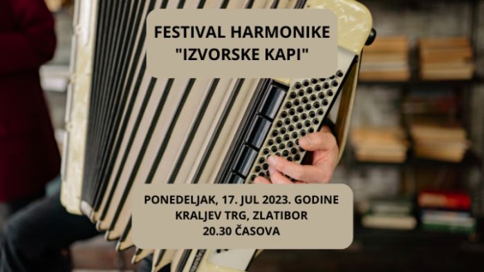 У оквиру манифестације „Златиборско културно лето 2023″, на Краљевом тргу на Златибору, у понедељак 17. јула са почетком у 20.30 часова, биће одржан Фестивал хармонике „Изворске капи“.