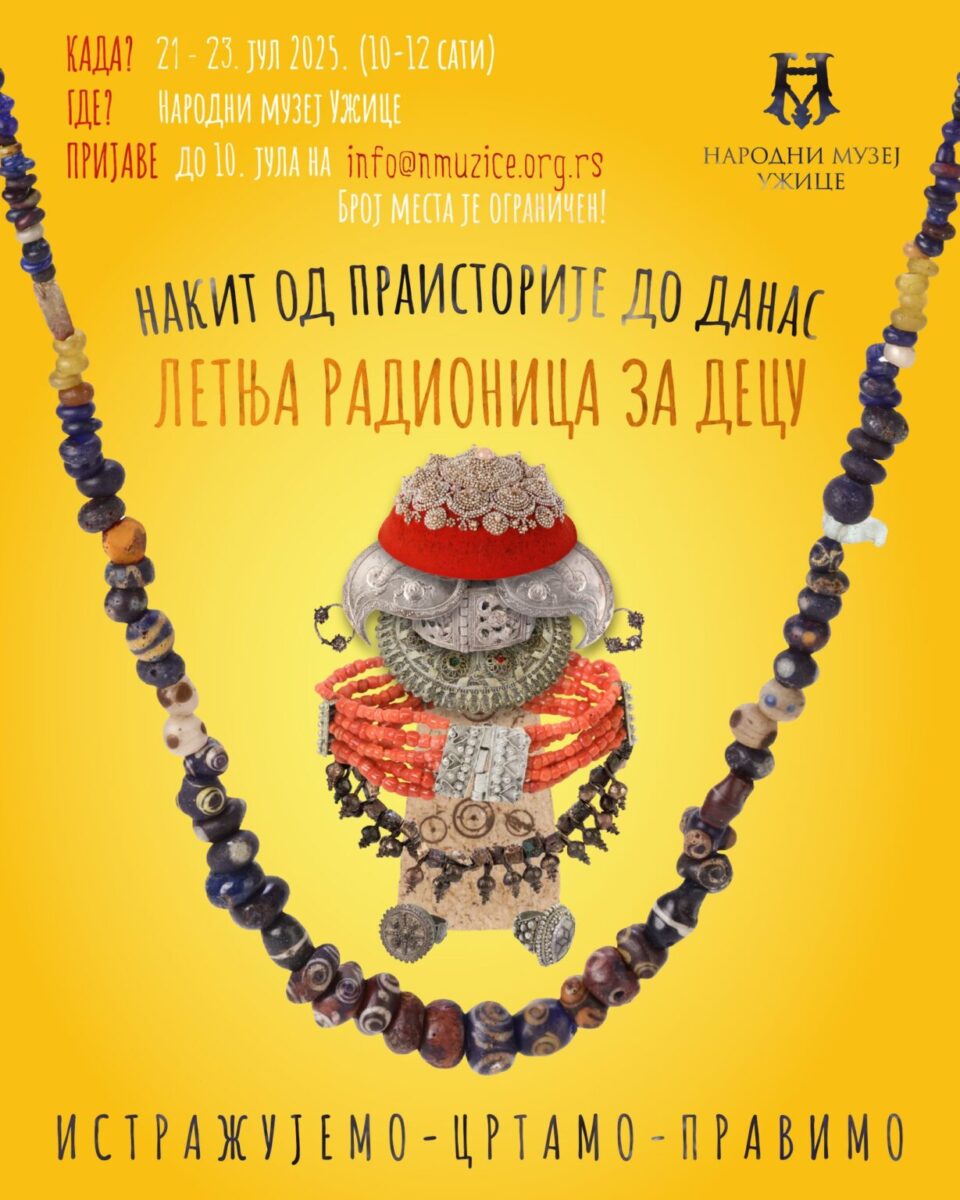 Креативно-едукативна радионица “Накит од праисторије до данас”, осмишљена да прикаже особености накита из збирки музеја и подстакне децу и младе у креативном раду, одржаће се у Народном музеју Ужице у периоду од 21. до 23. jула 2025. године.