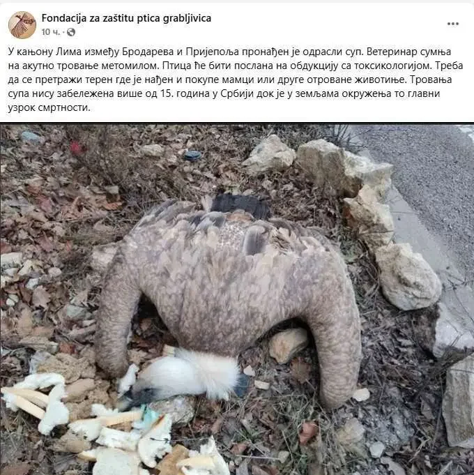 У кањону Лима између Бродарева и Пријепоља пронађен је одрасли белоглави суп који је показивао знакове акутног тровања, наводи се у објави Фондације за заштиту птица грабљивица.