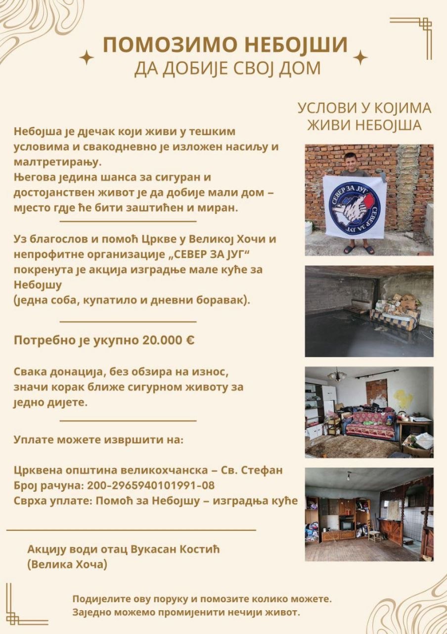 Хуманитарна организација „Север за југ“ упутила је апел за помоћ дечаку Небојши из Велике Хоче на Косову и Метохији, који живи у изузетно тешким условима и без адекватне породичне бриге.