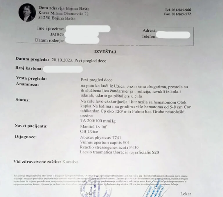 Сина је одвео код лекара у Дом здравља Бајина Башта. У извештају је наведено да је лекару рекао да су му повреде нанели полицајци, а лекар је констатовао контузију главе, хематоме на лицу и леђима.