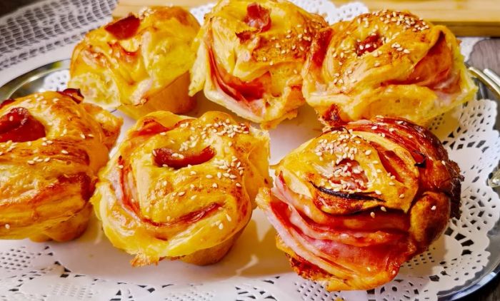 Сваку лоптицу развити танко у круг, па на средину ставити шунку и листове кајкавалија, савити са свих страна и прстима затворити.