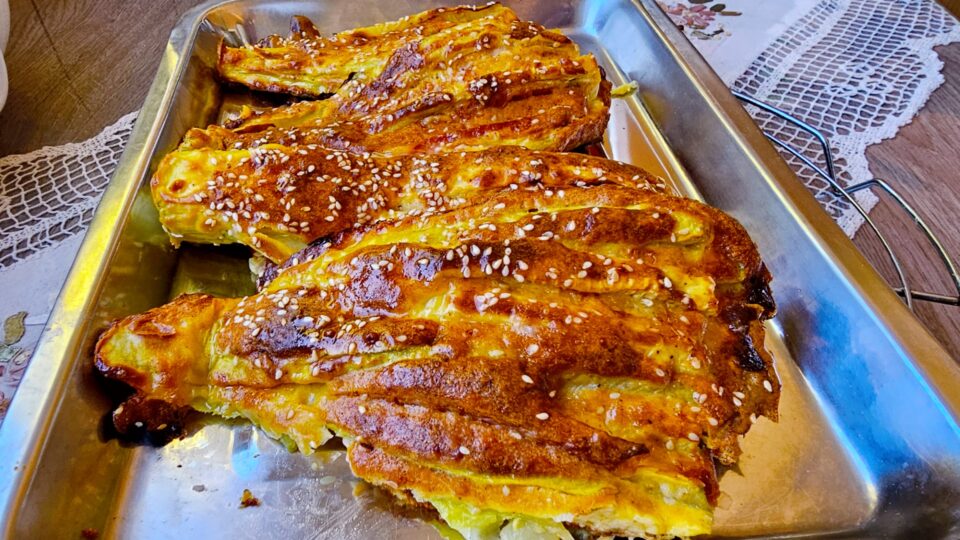Ређати у плех обложен пек папиром и премазати уљем . Пећи на 220 степени Ц 45-50 мин.