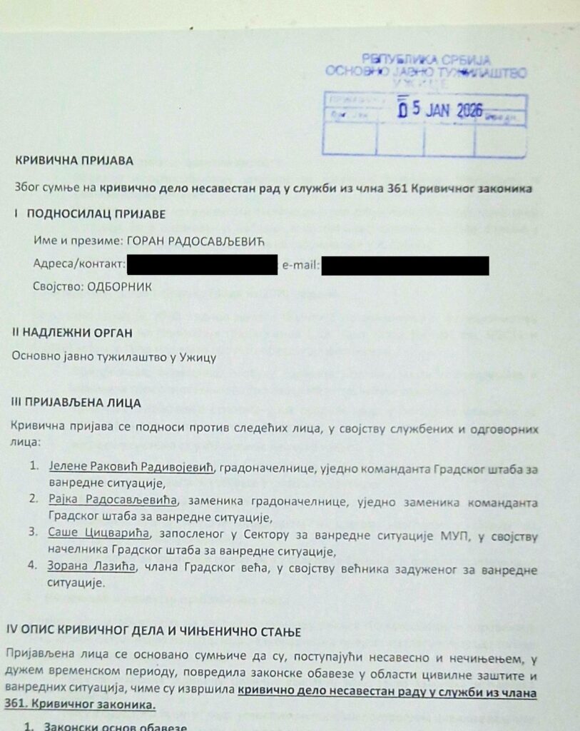 Србија Центар – СРЦЕ, Градски одбор Ужице, преко свог одборника у Скупштини Града, 05.01.2026. године поднео је кривичну пријаву Основном јавном тужилаштву у Ужицу против четворо надлежних и одговорних лица у органима Града, због основане сумње да су извршили кривично дело из члана 361. Кривичног законика – несавестан рад у служби.